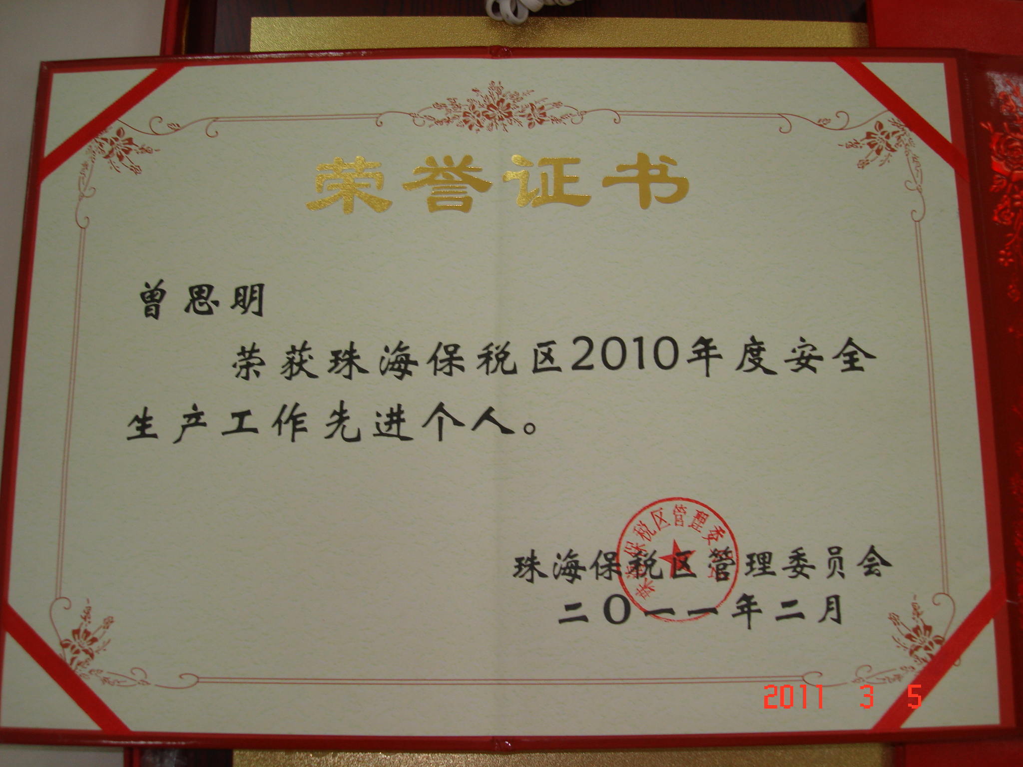 2011年剛邁入新的起點(diǎn),珠海中富喜訊不斷傳來(lái),先后被評(píng)為“2010年度經(jīng)濟(jì)工作先進(jìn)單位”和“2010年度安全生產(chǎn)工作先進(jìn)單位”。支持中心人事部的曾思明和張華芬同志也分別榮獲“珠海保稅區(qū)2010年度安全生產(chǎn)工作先進(jìn)個(gè)人”和“珠海保稅區(qū)2010年度勞動(dòng)保障監(jiān)察工作先進(jìn)個(gè)人”。