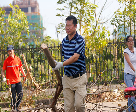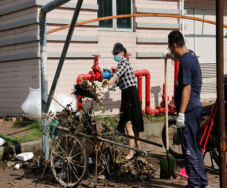 因2次臺風連續(xù)而猛烈的破壞,園區(qū)內(nèi)隨處可見倒臥的樹木及斷枝、被吹落的屋頂鐵皮、保溫棉垃圾。為盡快恢復園區(qū)的環(huán)境,29日在中共中富總支部的倡議下,由黨員、志愿者組成的搶險小分隊,頂著毒辣的太陽及高溫天氣,大家不怕臟、不怕累、手持砍刀將倒下的大樹鋸斷搬走,用掃把、鐵鏟將園區(qū)內(nèi)吹倒的樹桿、鐵皮、玻璃等垃圾雜物一 一清理干凈。在清理現(xiàn)場,公司領導張海濱總經(jīng)理親臨現(xiàn)場參加并指導。在熱火朝天的現(xiàn)場,不論是辦公室人員還是車間人員,不管是男同胞還是女同胞,均不分彼此,全力而為,隔著屏幕都能感覺到大家滿滿的正能量。無情的臺風雖然破壞了美麗的家園,卻也讓我們再次看到了一個個愿意奉獻、不怕辛苦的中富人。